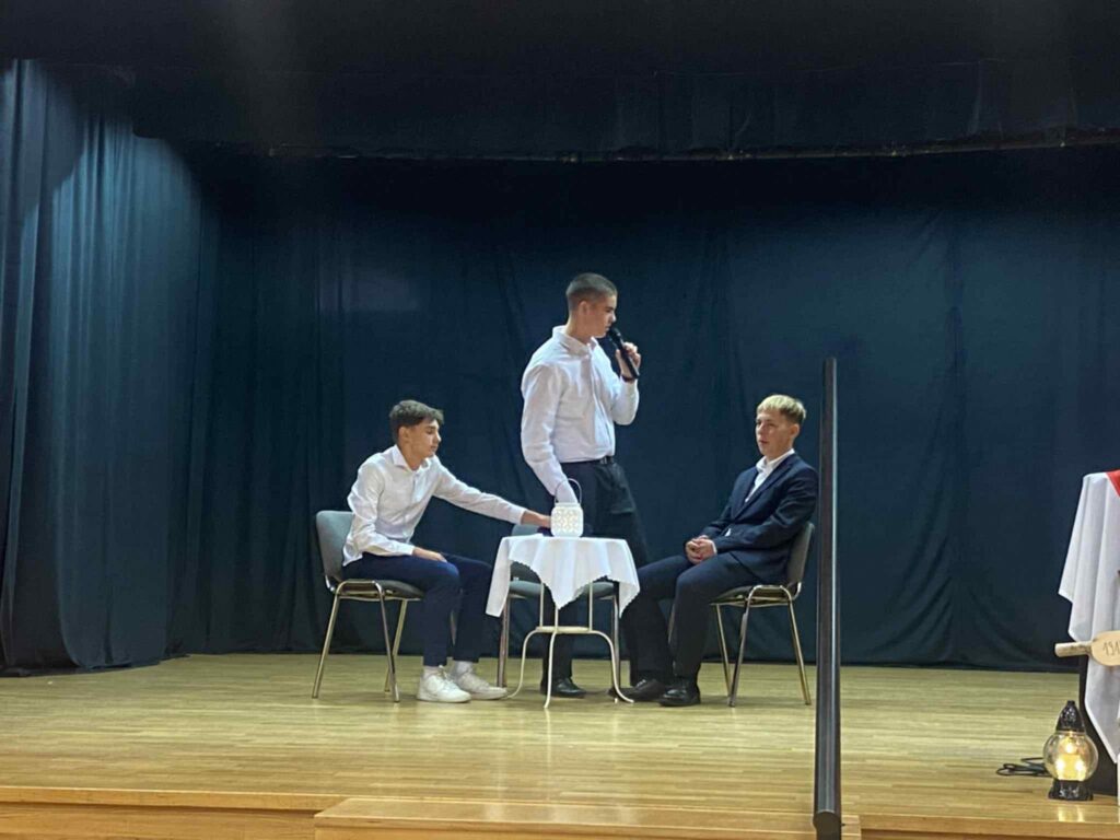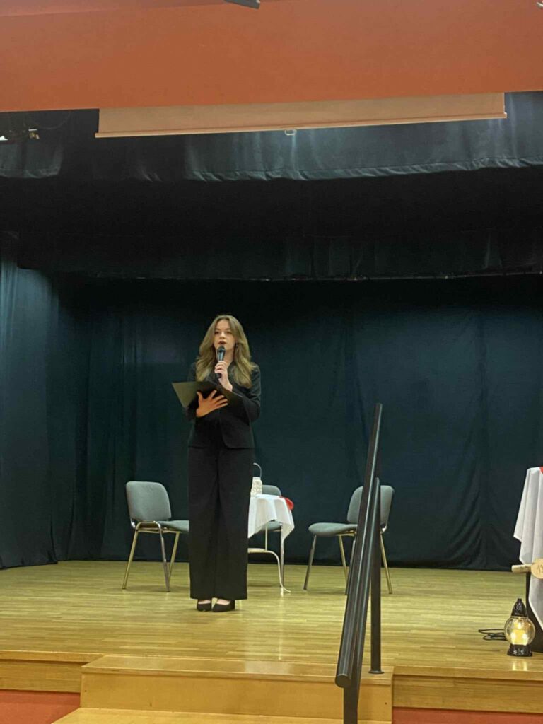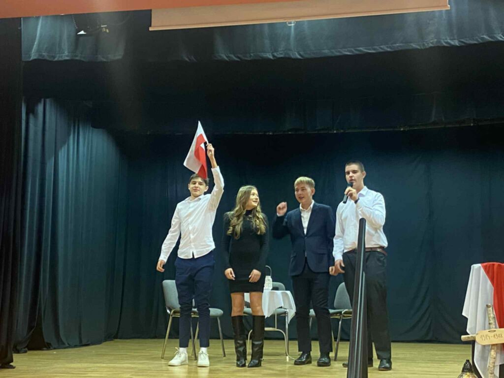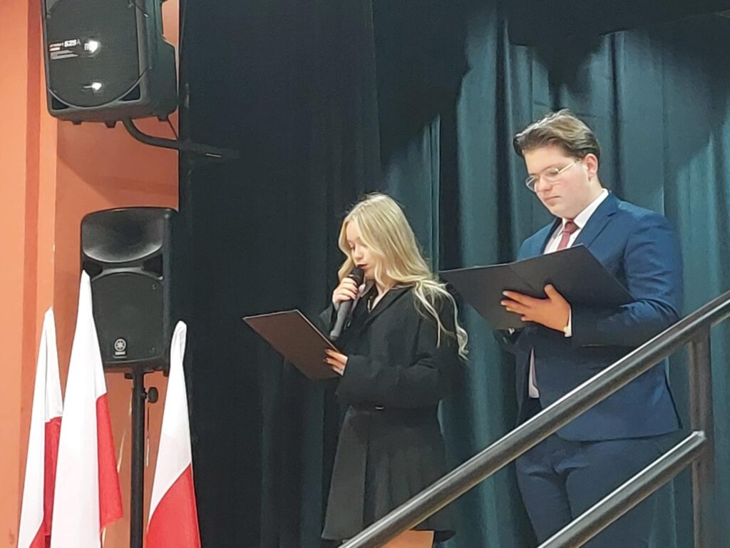 Uroczystość rozpoczęła się wspólnym odśpiewaniem „Mazurka Dąbrowskiego”, który wybrzmiał z prawdziwym wzruszeniem i dumą wśród całej szkolnej społeczności. Następnie uczniowie zaprezentowali montaż słowno-muzyczny, wypełniony poezją, pieśniami patriotycznymi oraz refleksją nad wartością wolności – dobra, które należy pielęgnować i chronić każdego dnia.