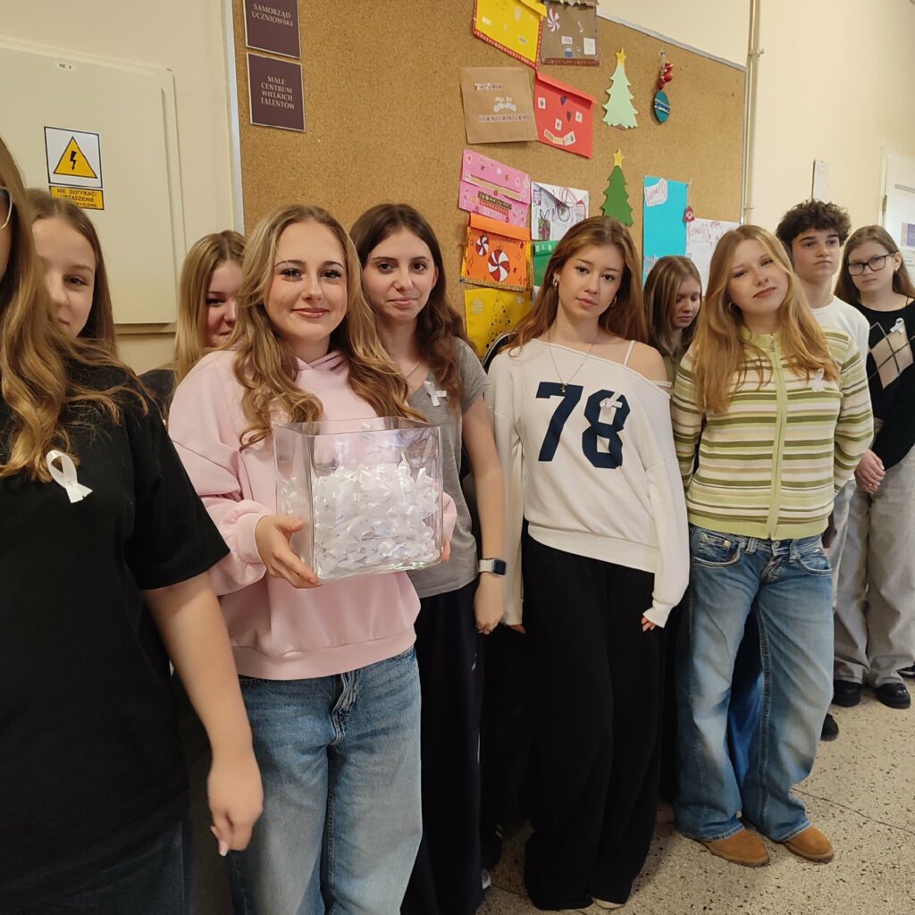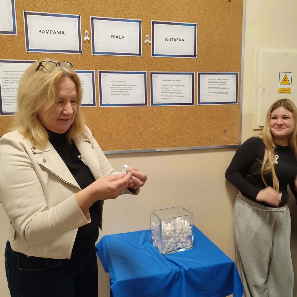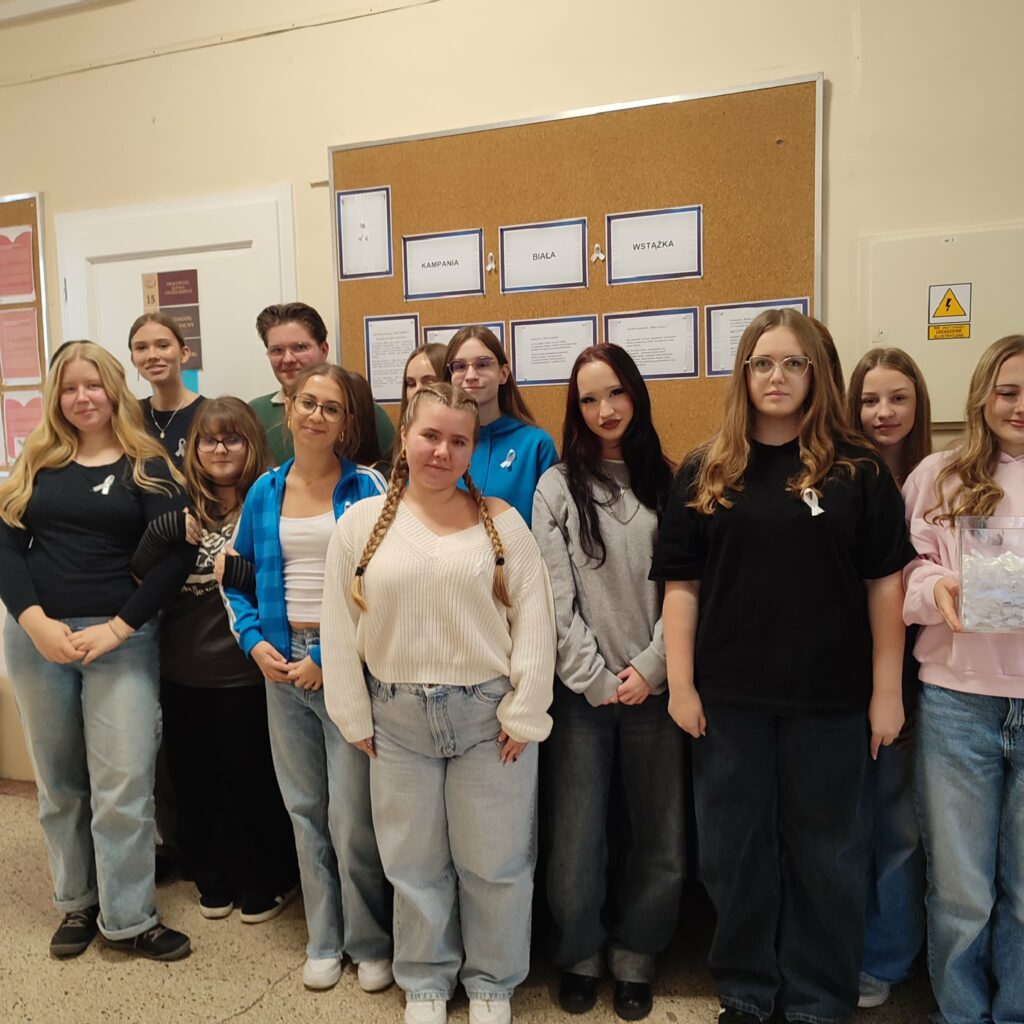 „ Biała Wstążka” – mała ale o wielkiej wymowie, jest osobistym zobowiązaniem noszącej ją osoby, że nigdy nie będzie stosować, akceptować lub milczeć na temat przemocy. Poprzez symboliczne przypięcie białej wstążeczki nasza społeczność szkolna wraz z nauczycielami kolejny już raz staje się ambasadorami kampanii i włącza się w międzynarodową akcję sprzeciwu wobec przemocy.