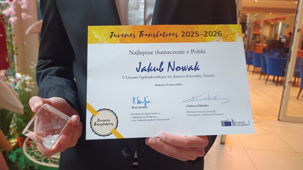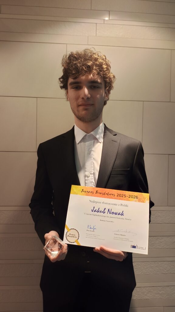 Nasz uczeń, Jakub Nowak, został laureatem tego prestiżowego konkursu – jego przekład uznano za najlepszy w Polsce! Tym samym znalazł się w gronie 27 zwycięzców, po jednym z każdego kraju Unii Europejskiej.