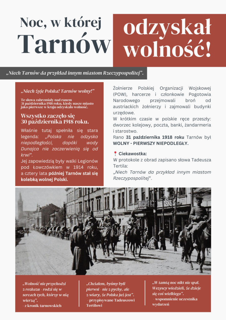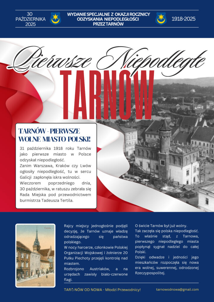 Ponad sto lat temu, w ostatnich dniach października 1918 roku, Tarnów przeżywał chwile przełomowe, miasto przygotowywało się do odzyskania wolności po latach zaborów. Mieszkańcy angażowali się w tworzenie struktur samorządowych i lokalnych inicjatyw niepodległościowych, a atmosfera niepewności mieszała się z nadzieją na nową, wolną Polskę.