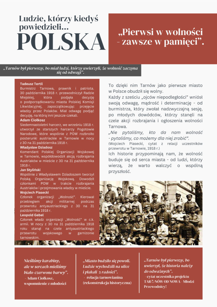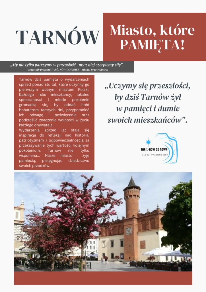 W projekcie TAR↻NÓW OD NOWA – Młodzi Przewodnicy! przypominamy te wydarzenia i oddajemy hołd tym, którzy wtedy z determinacją stawali po stronie wolności. Ich odwaga i zaangażowanie inspirują nas do poznawania przeszłości i aktywnego kształtowania przyszłości Tarnowa.