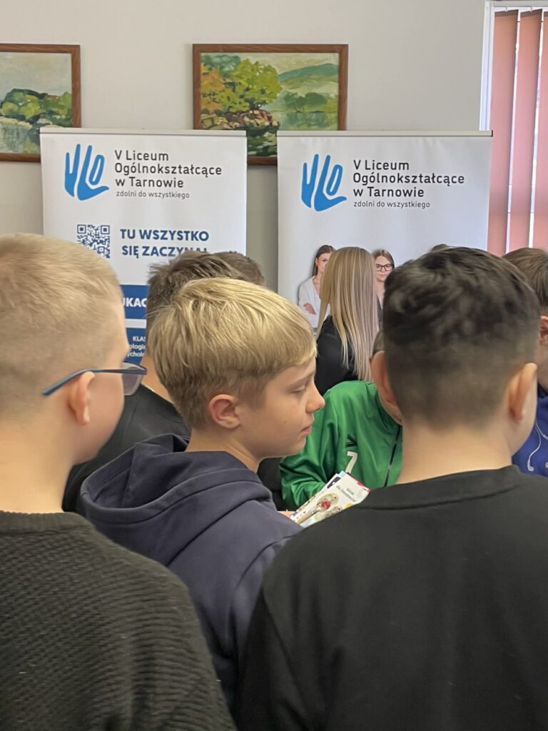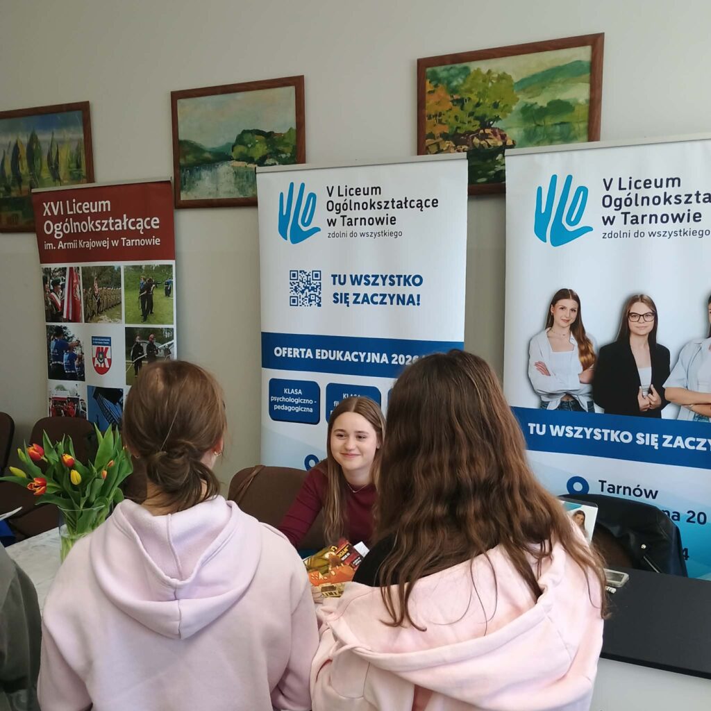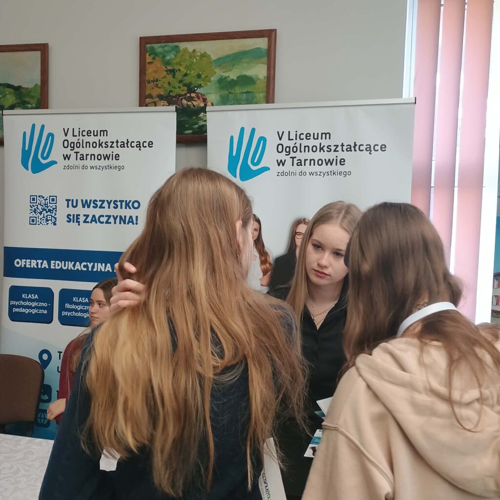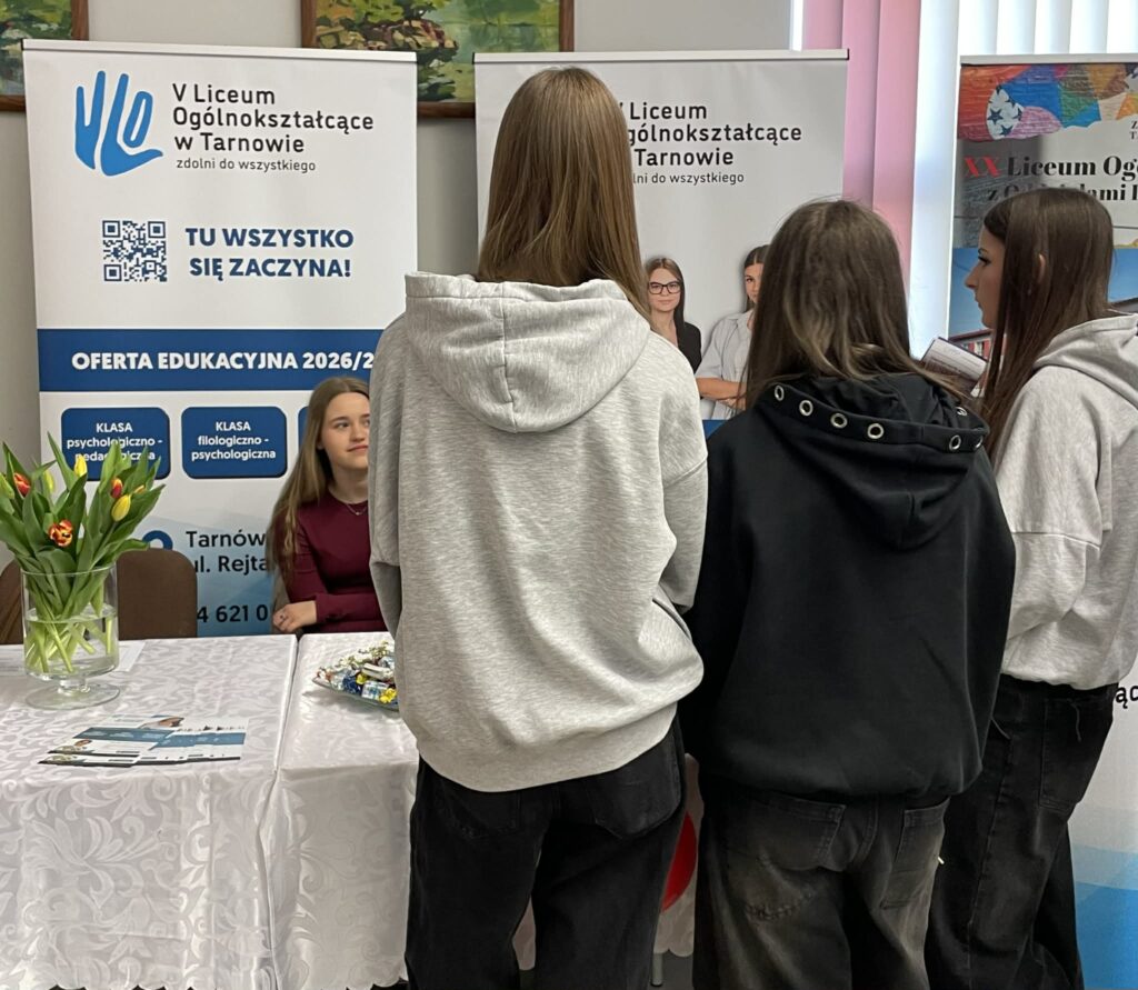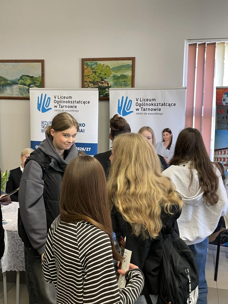 Przy naszym stoisku było naprawdę dużo energii! Odwiedzający mogli porozmawiać z naszymi uczniami i nauczycielami, dowiedzieć się, jak wygląda codzienne życie w V LO, a także zobaczyć przygotowane materiały i projekty szkolne.